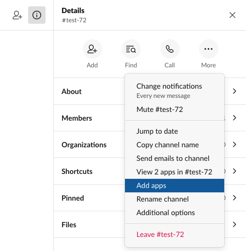 Now go to your slack instance. For any public channel go to info => more => add apps. In the search bar search for the name of your app. (If using the desktop version of slack, you may need to restart Slack for it to pick up the new app). Airbyte will only replicate messages from channels that the Slack bot has been added to.